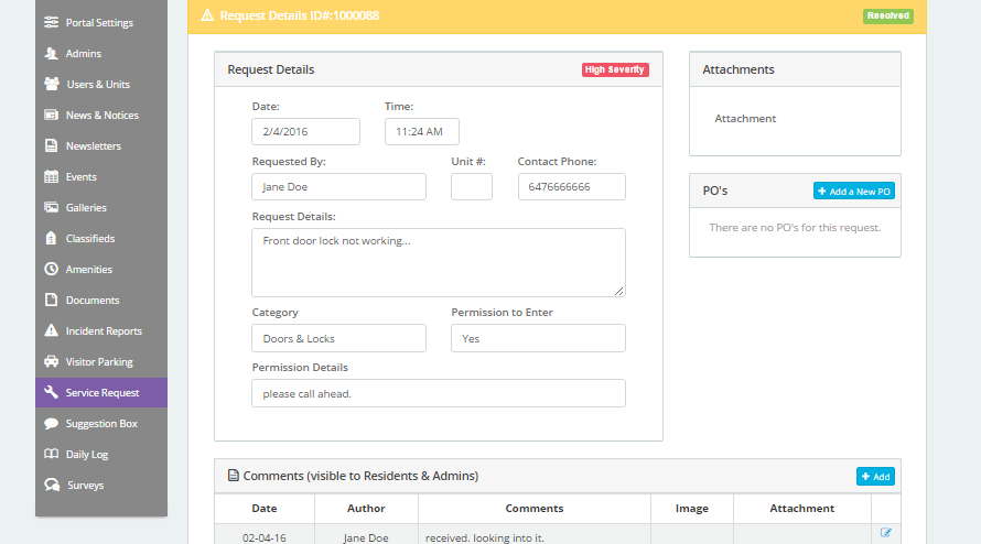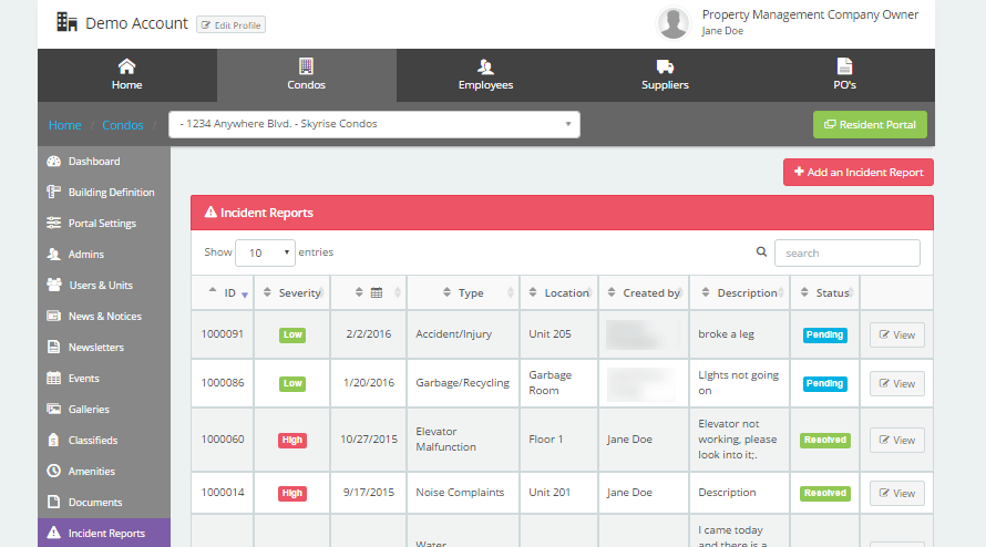 Keep an organized record of all incidents reported on the property. Residents can submit incident reports directly to property management.